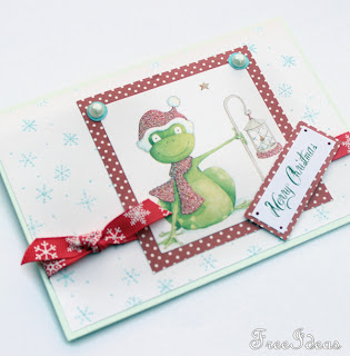 A dzisiaj wciąż świątecznie, tyle że bardziej na wesoło :) Przeurocza żabka, którą wygrzebałam ze świątecznego zestawu papierów 15x15. Z tego samego zresztą zestawu są kropeczkowe ramki jak i białe tło w błękitne brokatowe śnieżynki. Oczywiście papierki mam luzem więc nie mam zielonego pojęcia skąd je wytrzasnęłam i jakiej są firmy ale mają jeszcze kilka uroczych motywów (np. Kotek z okna z poprzedniego posta).
